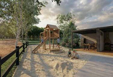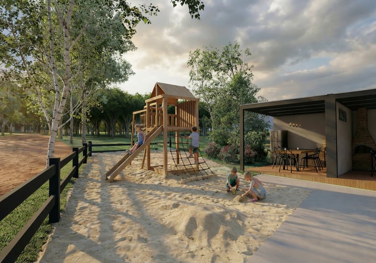 Espaços como pomar, playground e quadra para momentos em família.